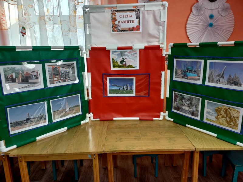 В детском саду был оформлен стенд «Стена памяти». Дети познакомились с памятниками расположенными в Тацинском районе и Верхнеобливском поселении. По средствам просмотра и беседы с детьми, прививалась любовь к Родине, интерес к ее героической истории. Дети понимали что надо чтить память о погибших в Великой Отечественной войне, проявляли чувство гордости за воинов-защитников.