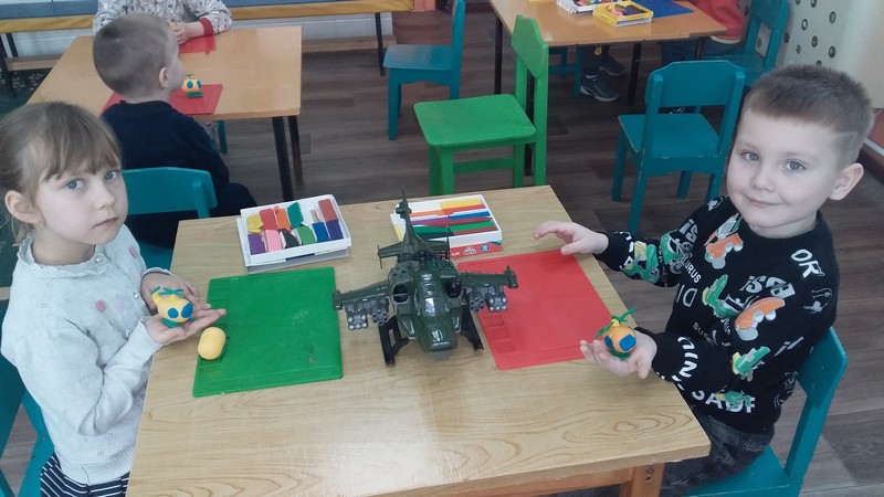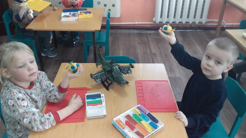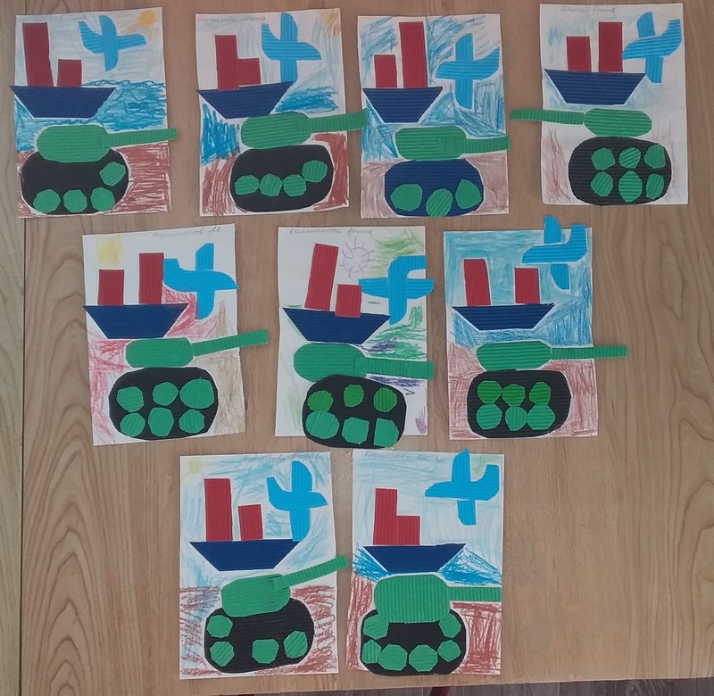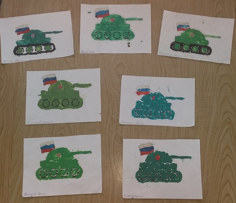 Все - представлено в виде детских игрушек, что позволило ей в игровой форме рассказать детям о военной технике, о дисциплине в армии, мотивировать ребят: какими должны быть настоящие бойцы. Результатом стало, что дети демонстрировали свои знания о нашей армии. Они называли рода войск, военную технику, перечисляли черты характера, необходимые защитнику Отечества. С детьми было запланировано и проведено: НОД (аппликация) на тему: «Летят самолеты и танки гудят!»; НОД (лепка) на тему: «Танки вперед». Мальчишки с огромным удовольствием конструировали военную технику. Все игры способствовали воспитанию чувства патриотизма.